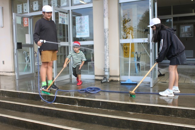 三用小学校の児童玄関はいつもきれいです。汚れていると進んでほうきで掃く子がいるからです。今日は朝清掃の日でした。「今日は、水を蒔いて掃除をしたいです。」と班長から提案があり、玄関担当の3人でブラシを使ってきれいにしました。掃除後には玄関タイルの色がより鮮やかになりました。玄関は学校の顔。これからもきれいさを保って使っていくことでしょう。