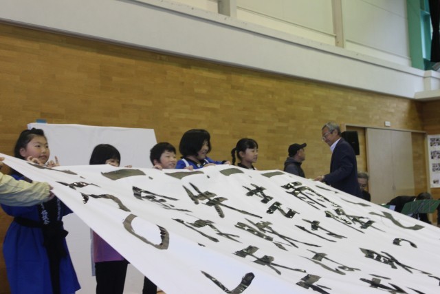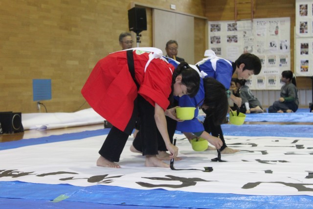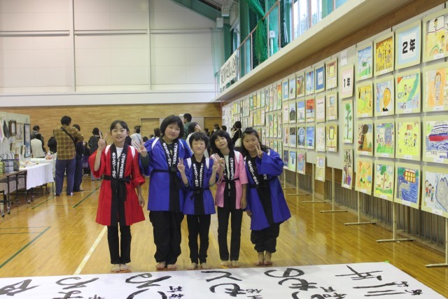 10月25日、26日に里山文化祭が八海山麓体育館を会場に開催されました。26日午後は地域の書道教室に通う子と希望者の5人で書道パフォーマンスを披露しました。まずは名前の紹介。一人一人が呼名されると堂々と大きな返事をし、やる気をアピールしていました。そしていよいよパフォーマンスです。はっぴにタスキをかけ、専用の大きな筆を持ち、用紙に立ち向かう姿がなんともかっこよく逞しささえ感じられました。2回練習したとあって、それぞれが分担されたことわざを大きく伸びやかに書き上げていました。がんばりました!かっこよかった!