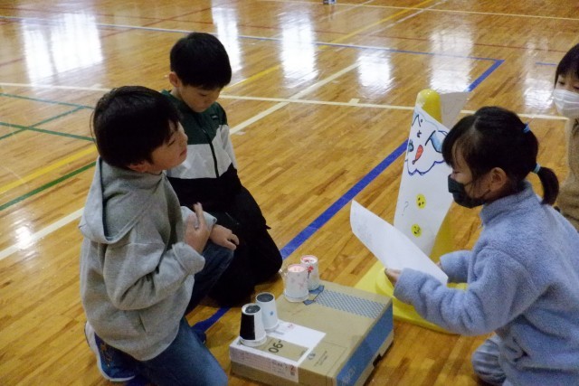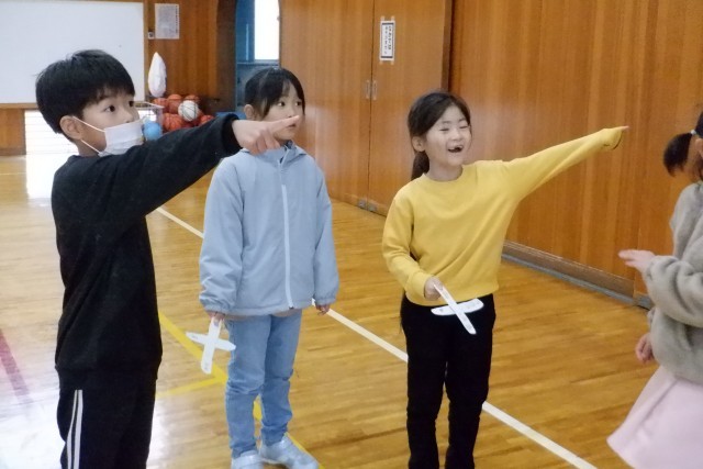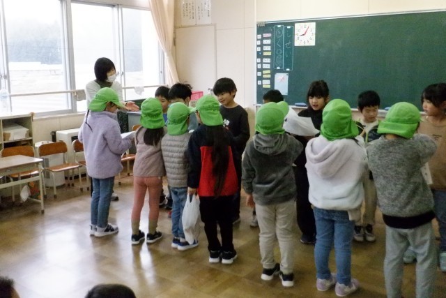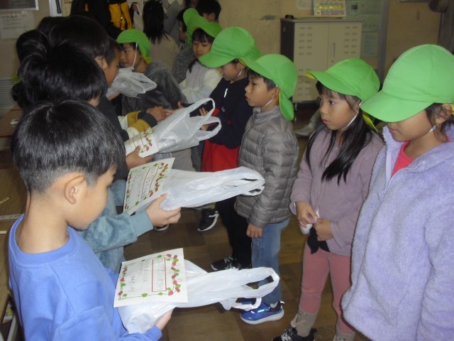 今日は1,2年生が生活科で作ったおもちゃランドに、三用保育園の年長さんを招待して一緒に遊ぶ日でした。まずは体育館で一緒に遊びました。広い体育館いっぱいに遊びのブースが設けられていました。もちろん、すべて1,2年生が作ったものです。初めに1,2年生は年長さんへ遊び方の説明をしました。年長さんがわかるように優しく丁寧に説明する姿に成長を感じました。次は、1年生教室で一緒に遊びました。お別れの前には1年生から年長さんにサツマイモのプレゼントです。袋には1メッセージが付けてあり、中には自分たちが収穫したサツマイモが1本入っていました。外は初雪が舞うほど寒い日でしたが、温かい気持ちになる素敵な交流になりました。