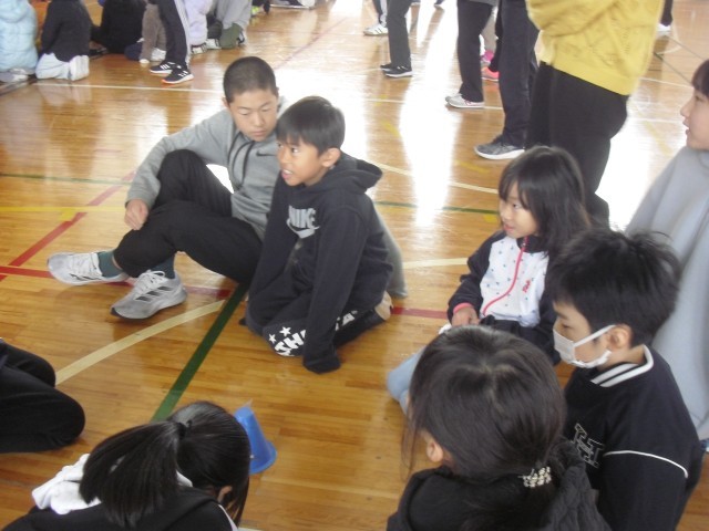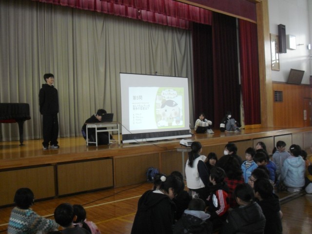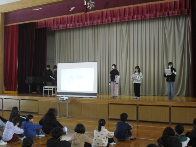 今日の青空朝会は、図書委員会による企画「縦割り班で絵本クイズを解いてみよう」でした。「『大きなかぶ』の最後にかぶを抜いた動物は何でしょう?」など6問のクイズが出題されました。「『100かいだてのいえ』の60階に住んでいる生き物は何でしょう?」は難問でした。最後は全問正解の班に拍手を送りました。校内読書旬間にあわせた素敵な企画でした。