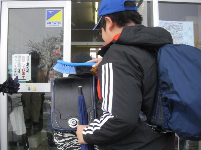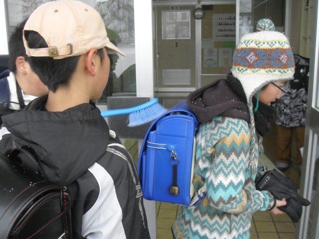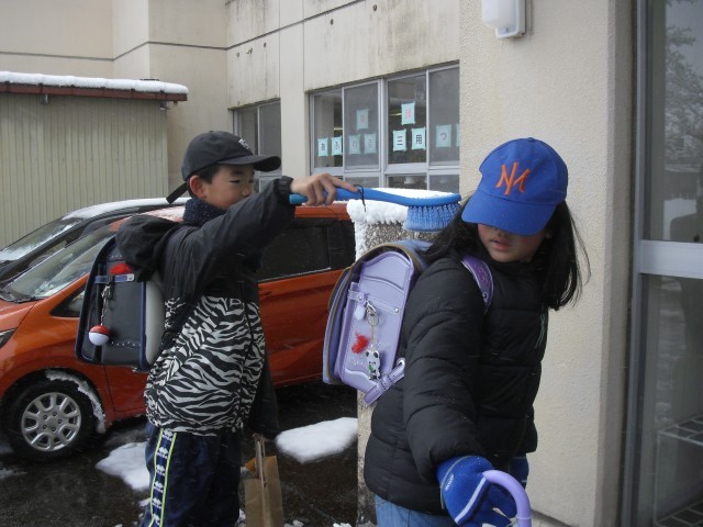今朝は昨日と一変し、あたり一面銀世界でした。登校時、歩いて来る子の中にはランドセルに雪がついている子もいました。児童玄関には専用の雪落としブラシが二つかけてあります。こちらが何も言わずとも、上学年が下学年の子のランドセルについた雪をブラシを使って落としているではありませんか。それが当たり前のように行える三用っ子に感心しました。