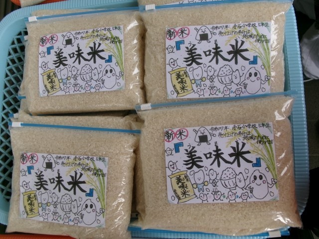 第4回東地区新米まつりで5年生が作ったお米「美味米」を販売しました。当日はたくさんの方々からお越しいただきお買い求めいただきました。子どもたちも喜んでいました。この日は、「ぬか釜」で炊いた新米コシヒカリも味わうことができ、改めて東地区の素晴らしさを実感することができました。