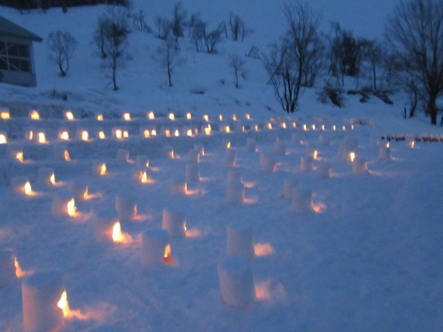 地元のスキー場で恒例のホワイトカーニバルが行われました。いろいろなアトラクションや催しがあり、たくさんの人が楽しんでいました。赤石小の子どもたちも楽しんでいました。今年は、東地区地域づくり協議会が主催する「結の灯り」も同時開催で行われました。赤石小学校の子どもたちが紙コップにメッセージを書きました。自分の書いた紙コップをみつけ、喜んでいる子どももいました。みんなの思いが灯りとなって夜を包みました。