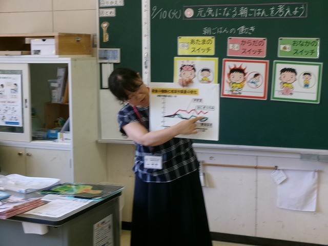 大和給食センターの栄養教諭の方々から来ていただき食に関する授業を行いました。3・5年生ともに朝食についての授業でした。朝食の大切さや栄養のバランスについて考えました。