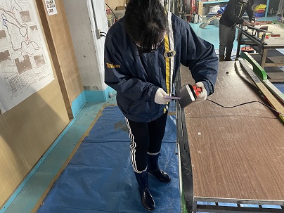 ワックスがけ用のアイロンを使い、ワックスを溶かして塗り伸ばしていきます。その後、スクレーパーで余分なワックスを削り取り、ブラシをかけていきます。