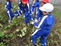 1年生が畑で育てたさつまいもの収穫をしました。葉っぱもかなり元気よく茂っている畑で、長靴・軍手・体操着の長袖長ズボンと身支度バッチリの1年生が大奮闘です。みんなで協力して茂っている葉っぱをひっばり、芋...