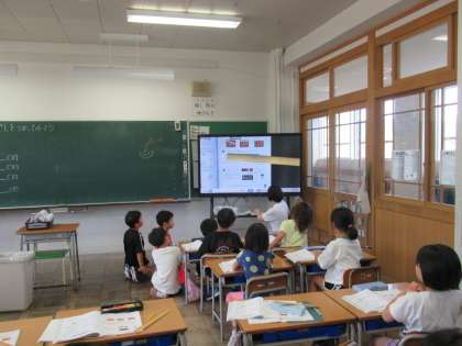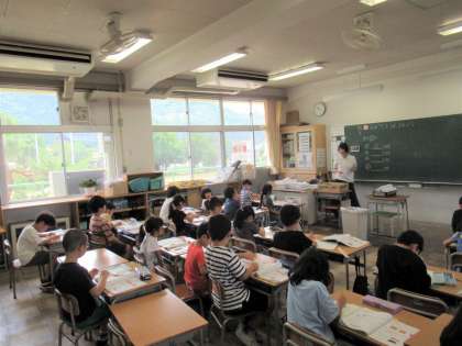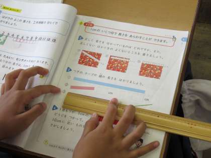 6月17日(月)3時間目、2年生は算数「長さ」の学習です。30センチものさしを使って、教科書の問題にある線の長さを測っています。