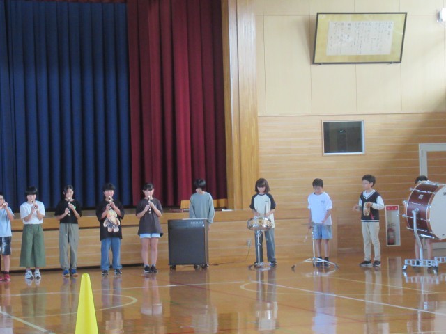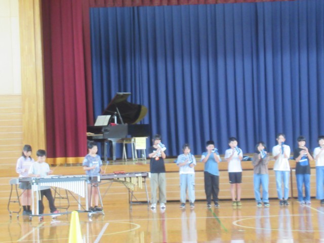 体育館をのぞくと、5年生はちょうど合奏の練習中です。星野源さんの「ドラえもん」の曲です。