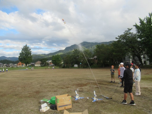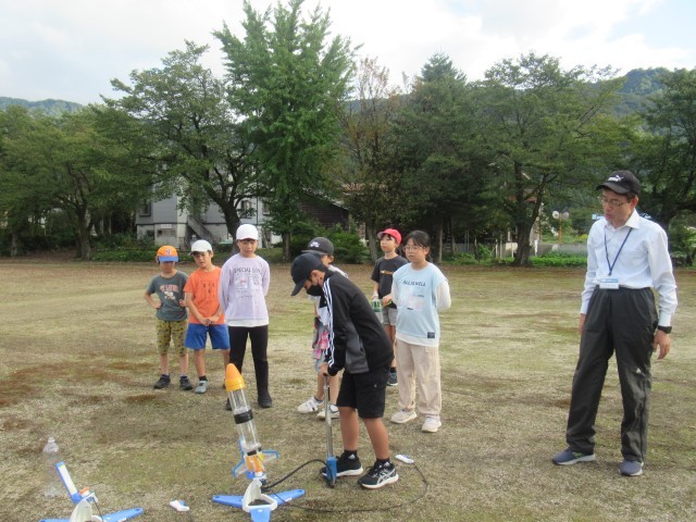 科学クラブでは、今回は南魚沼市学習指導センターの先生からもお手伝いをいただき、ベットボトルロケットにチャレンジしていました。