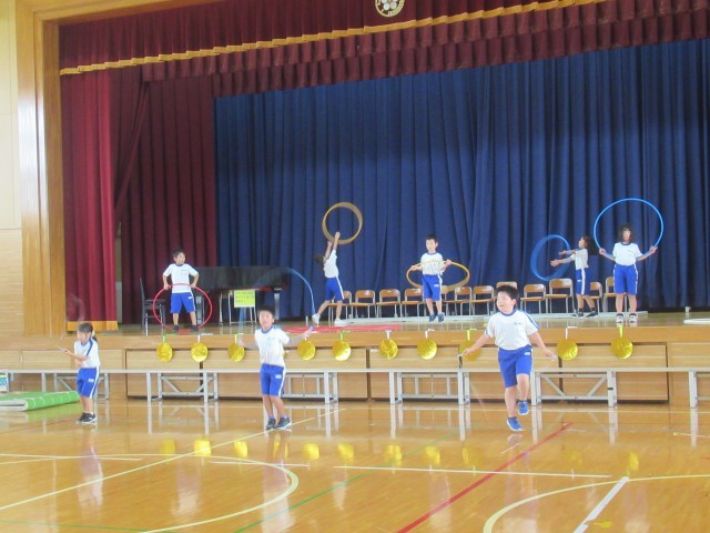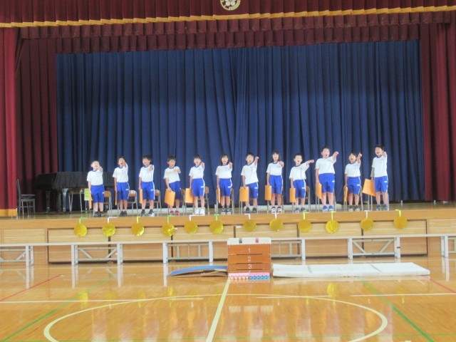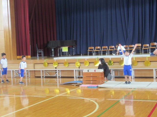 「ちびっこオリンピック2025」の名前のとおり、2年生の子どもたちが体育で学習した様々な技を披露していきます。