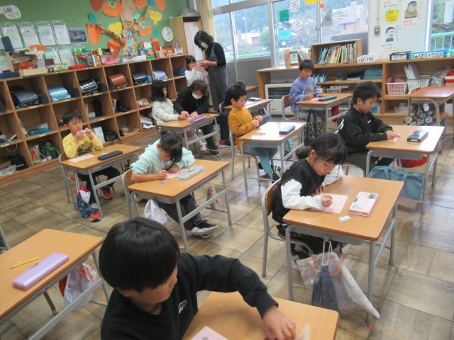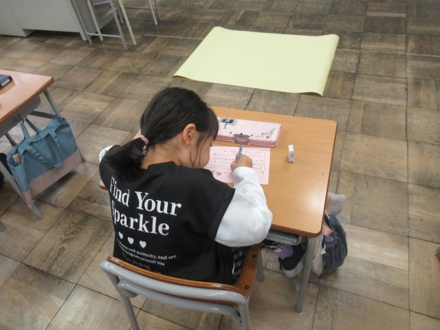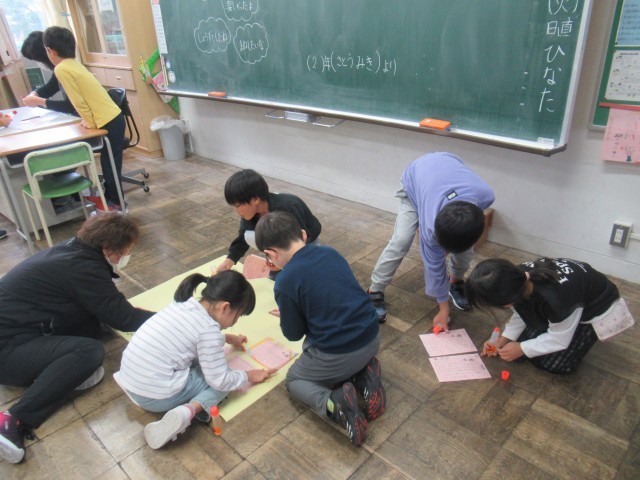 5年生に見てもらえるように、書きおわったカードを大きな紙にはっていました。みんながにこにこ顔で活動できました。