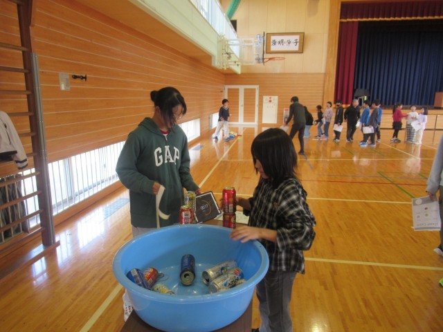 入り口でもらった「スタンプカード」を見ると、射的・ボーリング・魚釣り・空き缶つみ・輪投げ・的当ての6つのコーナーがあることがわかりました。一つのコーナーで遊ぶと、カードにシールをはってもらうシステムです。かなり長い列ができているコーナーもありましたが、待っている時間も、おしゃべりをしたり、やっている人の様子を見たりと、楽しそうです。