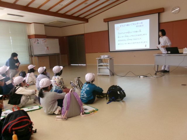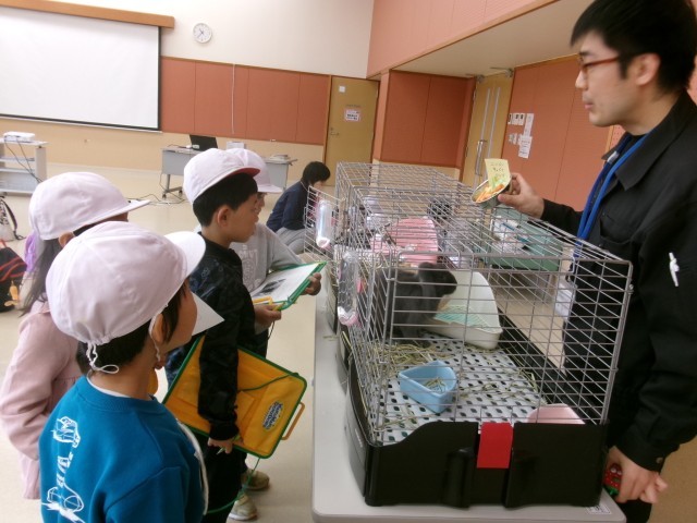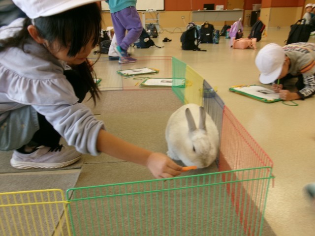 動物愛護センターでは、動物と仲良くするために気を付けることや命の大切さについて教えていただいた後に、うさぎやモルモットと触れ合ったり、えさをあげたりしました。
