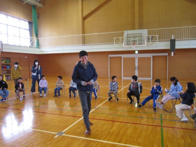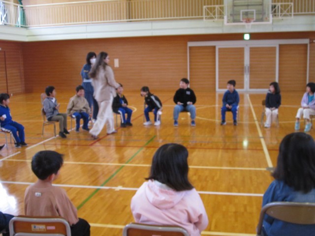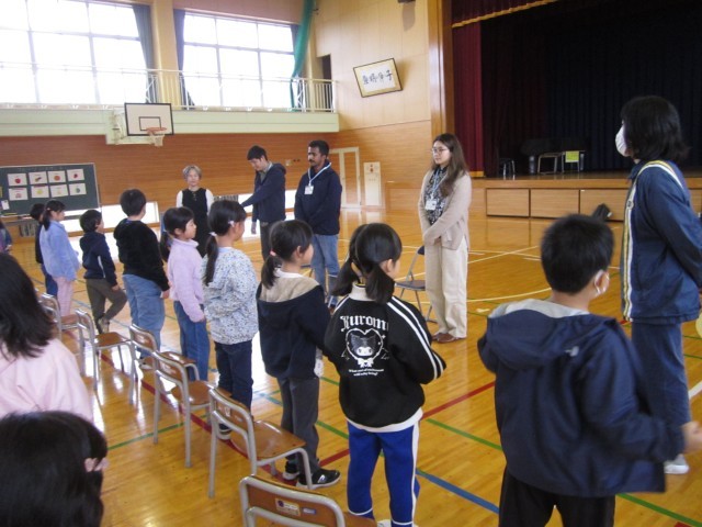 1,2年生は、最初に一人一人が自己紹介を行いました。1年生は、自分の名前を、2年生は自分の名前と好きなものについて英語で話しました。緊張しながらも、しっかりと伝えることができました。