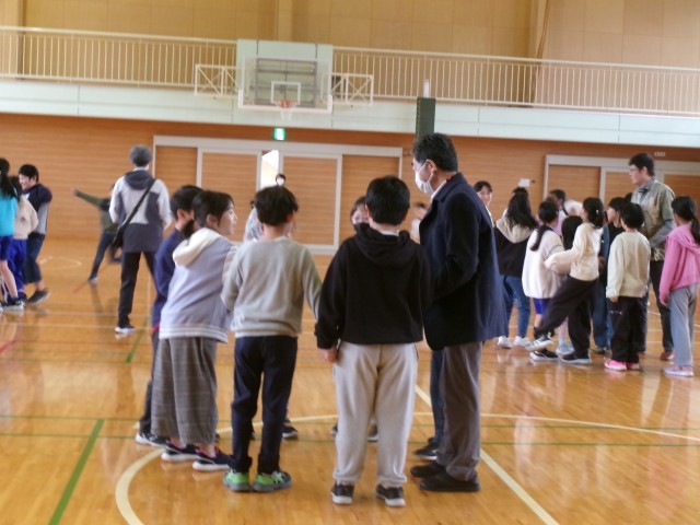 3,4年生は、英語バージョンの猛獣狩りゲームをしました。ALTのジーン先生が黒板に英単語を書くと、その文字数と同じ人数のグループになるゲームです。