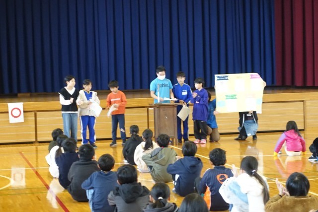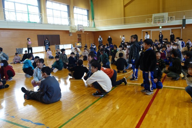 表彰の後は、委員会企画の「図書館・本に関する〇×クイズ」です。「知っていたようで知らなかった」図書館にある品物や本の豆知識など、工夫された問題に子どもたちは大盛り上がりでした。クイズが進むにつれてヒートアップする体育館でしたが、ここで、大崎の子どもたちのよさが感じられることがありました。クイズの興奮でなかなか静かにならなったとき、「静かにしてください」と、委員会の子どもが呼びかけると、子どもたちは、「みんなでクイズを楽しみたい」「委員会の子どもたちに協力しなきゃ。」という気持ちからか、すっと静かになったのです。みんなで楽しい時間を過ごすためには、何が大切かを考えられる子どもたちに育っていることが感じられました。