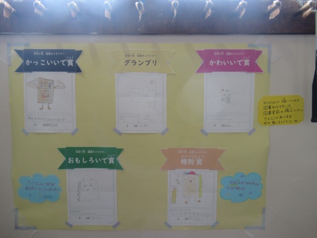 まず、全校から募集した図書キャラクターの表彰式が行われました。賞の種類は、「グランプリ」「かっこいいいで賞」「かわいいで賞」「おもしろいで賞」「「特別賞」の5種類です。子どもたちの豊かな発想と創造力が光るキャラクターばかりでした。