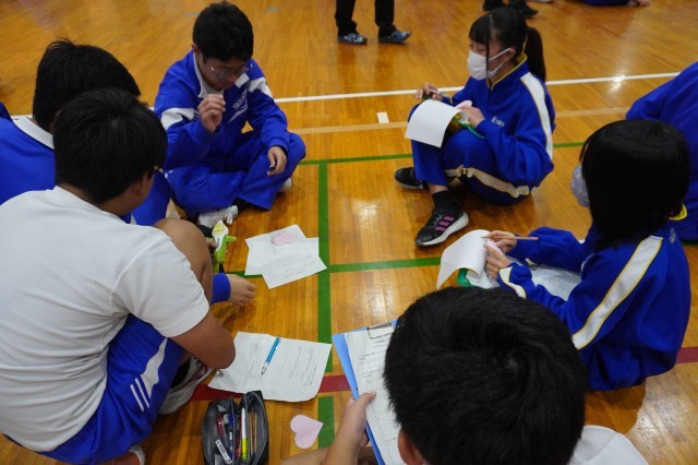 第二部は、大和中学校の1,2,3年生と一緒に活動しました。6年生は一人一人が中学校の1,2,3年生と一つのグループになり、いくつかの教室に分かれました。その後、体育館に移動し、生徒会のみなさんが提示したいじめについての場面について、どこがよくなかったのか、どうしたらよかったのか、グループごとにいじめについて考えたり話し合ったりしました。最初は緊張した様子でしたが、少しずつ表情が和らいでいきました。