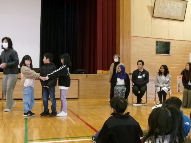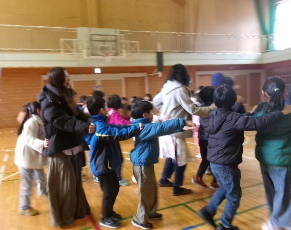 1,2年生の交流会では、体育館全体を使って「じゃんけん列車」と「木とリス」のゲームをしました。一緒にじゃんけんをしたりゲームをしたりと留学生の方と触れ合いながら思い切り楽しむことができました。