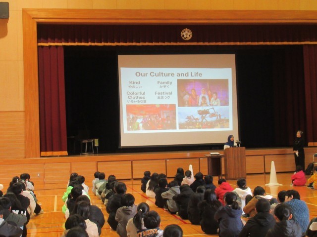 1時間目の全体会では、それぞれの国の食べ物、有名はお祭りなどについてのお話を聞いたり、あいさつの言葉を教わったりしました。