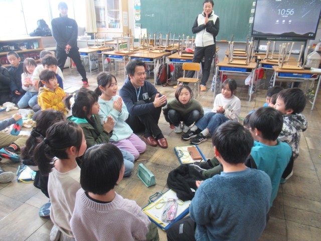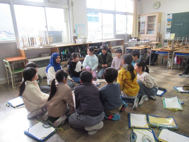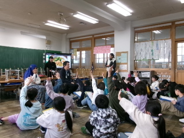 留学生のみなさんも、子どもたちと一緒にゲームをしているとき、自然と笑顔になってゲームを楽しんでいただきました。最後はどちらの学年も留学生の方に質問をしました。答えていただいた子どもたちは、みんなうれしそうでした。