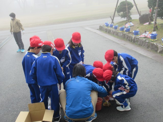 チューリップの球根の色は、赤・黄色・白・ピンクの4色です。一人が3つずつ球根を植えられるので、順番に好きな色の球根を選んでいます。3巡目になると、黄色の球根があと一つになり、希望者が集まってじゃんけんになりました。あいこが続き、なかなか決まりませんでしたが、ようやく決定。負けた人も、すぐに違う色を決めていました。