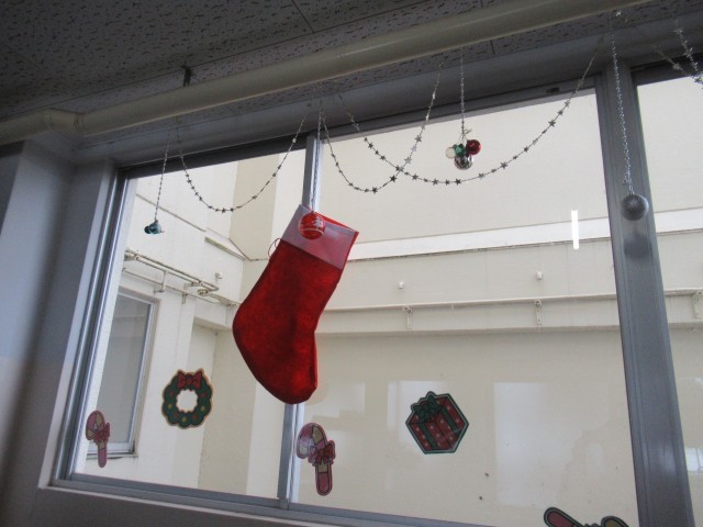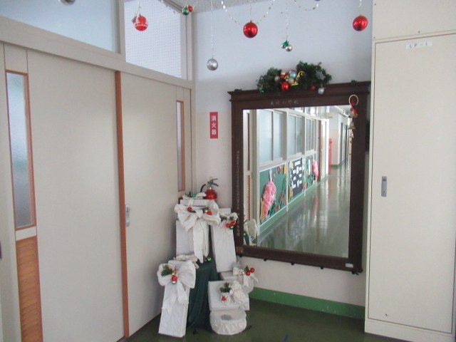 一階の家庭科室前のスペースが、クリスマスのオーナメントなどで飾られています。