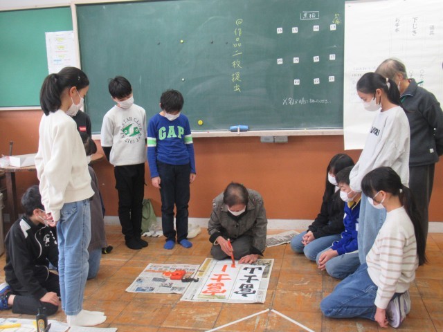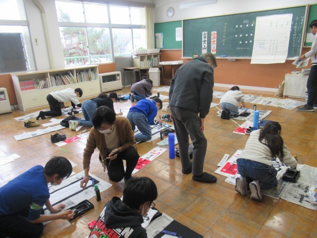 先生の周りに集まって、実際に筆の動かし方やポイントを教えていただいのですが、その後自分たちが書く場面になると、さっと集中して書き始めていました。