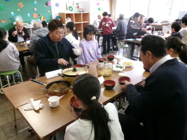 収穫したお米を炊いたご飯の上に青菜や炒めた卵などをのせた三色丼と、お味噌汁を食べていただきました。切ったり、炒めたりとがんばって作ったものを美味しく食べていただくことができました。