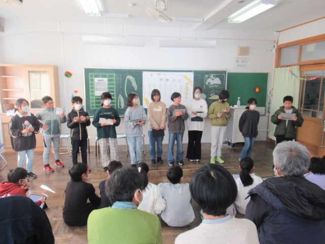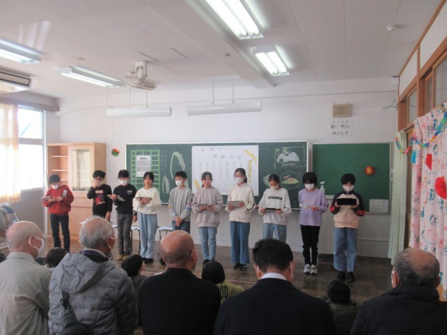 その後、一人一人がこの一年の米作りで学んだことを1分間スピーチとして発表しました。昔の米作りの大変さを実感できたこと、稲刈りや田植え、代掻きは大変だったけど面白かったこと、お米を収穫できてうれしかったこと、地域の方やはなさきボランティアのみなさんのおかげでお米を作ることができたことなど、一年を振り返って感じたことや考えたことをしっかりと発表していました。どの子どもも、自分の言葉で発表することができ、とても立派でした。
