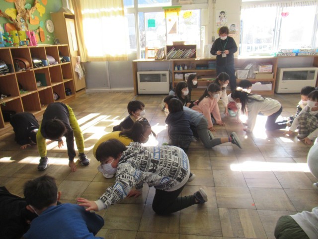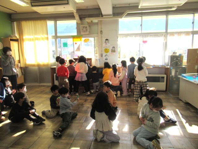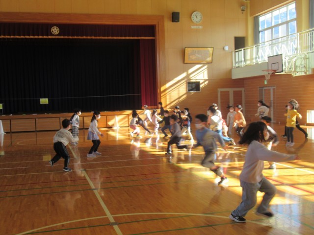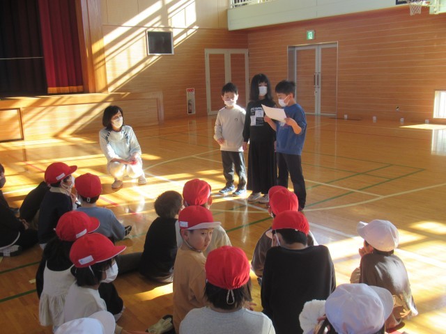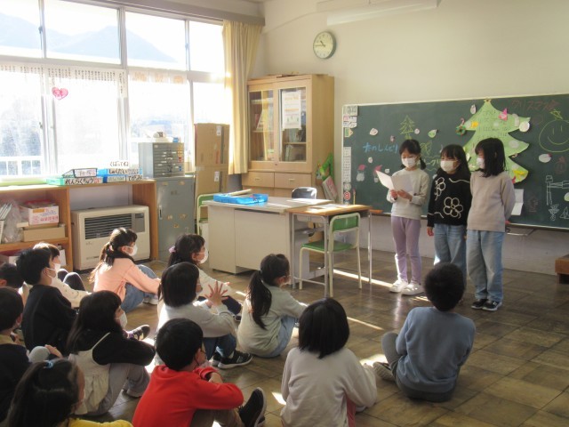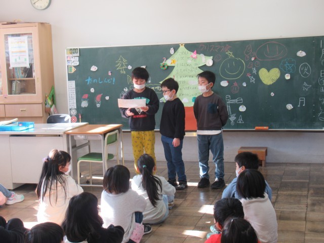 2年生が1年生を招待して、一緒に楽しいクリスマス会をしていました。内容は「たからさがし」「おんがくまねっこ」「ゴリラ」「ドッジボール」です。