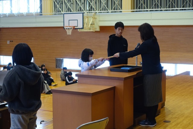その後の意見発表では、1,3,5年生の代表の子ども3人が、2学期がんばったことや3学期のめあてをしっかりと発表していました。また始業式後には、図工のコンクールの表彰を行いました。呼名された子どもたちは、元気よく返事をしていて立派でした。