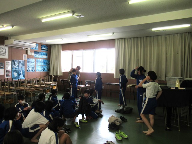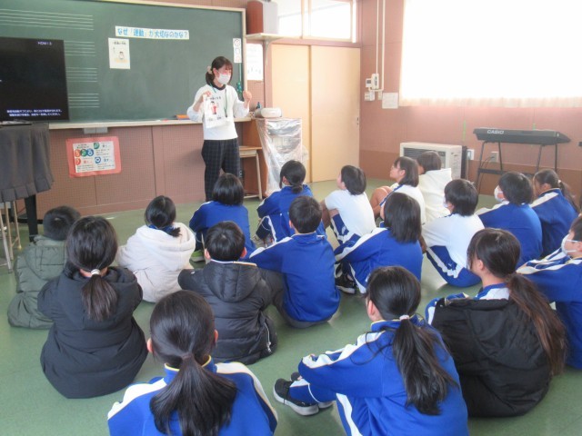 「なぜ運動が大切なのかな」という問いには、子どもたちからは「おなかがすく」「汗をかく」「汗をかいて毛穴がきれいになる」「太らない」など、多彩なつぶやきが出てきました。その後、養護教諭から「肥満の予防」「筋肉が強くなる」「ストレス解消・心の安定」「骨が強くなる」「病気になりにくい」「脳の成長」「便秘の予防」という7つの運動の大切さについて、話を聞きました。その後「一日一回は体育館(運動)」を5年生は実践していこうと担任と確認していました。
