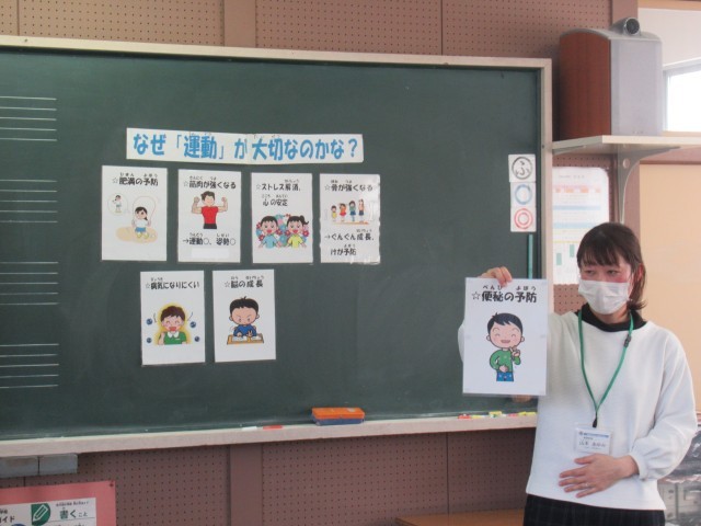 発育測定では、養護教諭が保健指導をする時間もあります。5年生では、「運動の大切さ」をテーマのお話でした。