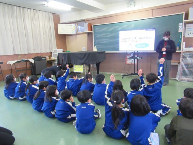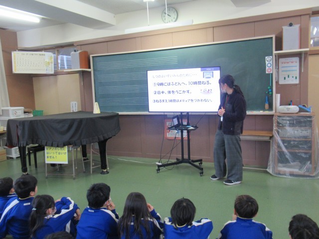 また、1年生のGGアンケートの結果から、1年生の平均睡眠時間が9時間だけど、できれば10時間取るようにしよう、というお話や、たっぷり眠ると脳の中の「かいば(海馬)」がよく働いて記憶力がアップしますよ、というお話を聞きました。