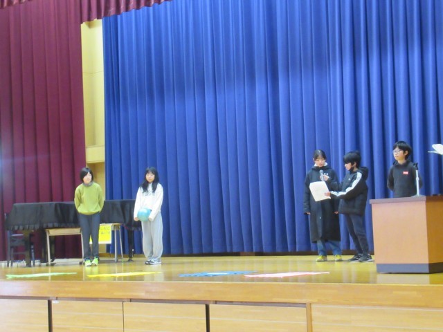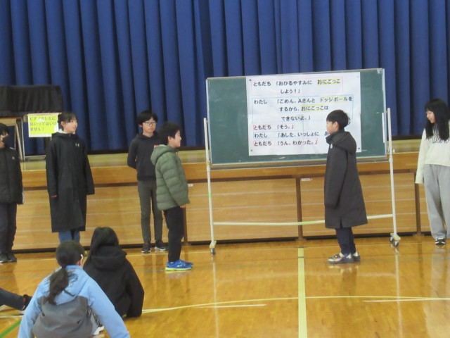 最初は生活委員会の子どもたちによる劇です。ドッジボールに誘った友達に対して、断りの言葉をどう伝えるか、2つのパターンの劇をすることで、フロアにいる子どもたちに、どのような言葉で断りの気持ちを伝えるとよいのかを考える機会としました。