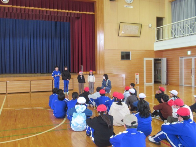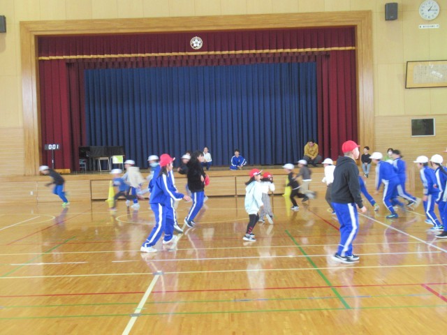 「ふえおに」と「ゴリラ」を楽しく遊びました。ゴリラは、前にいる「おに(ゴリラ)」をすり抜けて反対側まで逃げるおにごっこですが、1回目の2年生だけがおにのときには、なかなか6年生を捕まえられず、5年生の体育委員会の子どもが助っ人として動いてくれました。