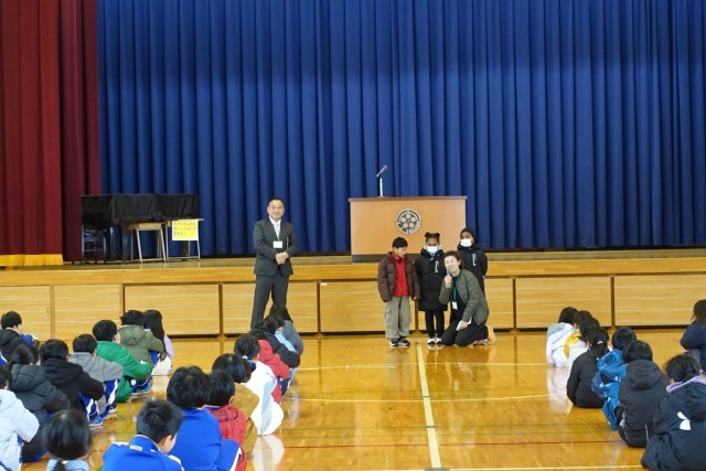 臨時全校朝会では、転入生の3名の子どもたちが英語で自己紹介をしました。