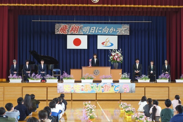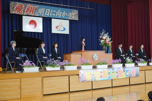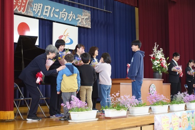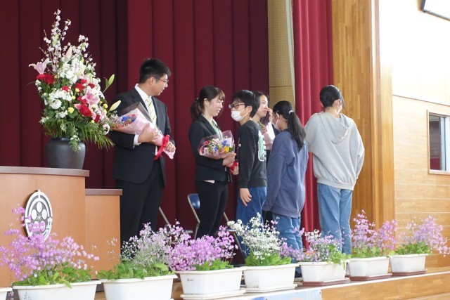 今年度末で転出される先生方とお別れする離任式を行いました。それぞれの先生方から、お別れの挨拶をしていただいたり、代表児童が花束をお渡ししたりしました。