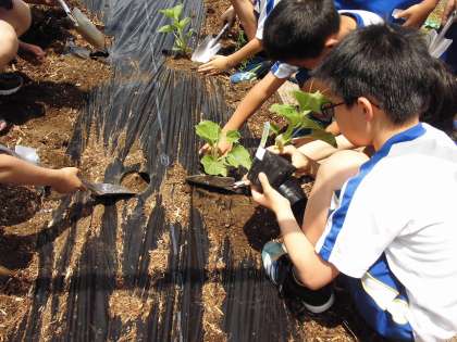 「植物の育ち方を調べよう」の学習をするために、4年生が「ひょうたん」の苗を植えました。ひょうたんの種類は「千成ひょうたん」です。