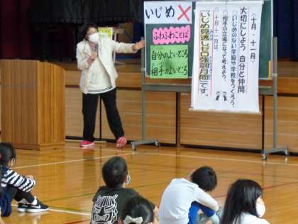 10,11月の生活目標は、「大切にしよう 自分と仲間」です。生活委員会の5,6年生が劇を通して仲間を大切にしようと全校に呼びかけました。