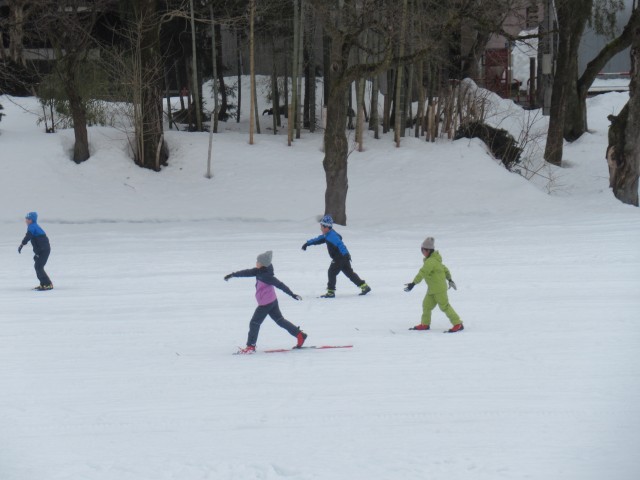 ストックをもって滑ると、今度は思い切り板にのって滑る様子が見られました。小雨の中でしたが、4年生みんなで頑張っていました。