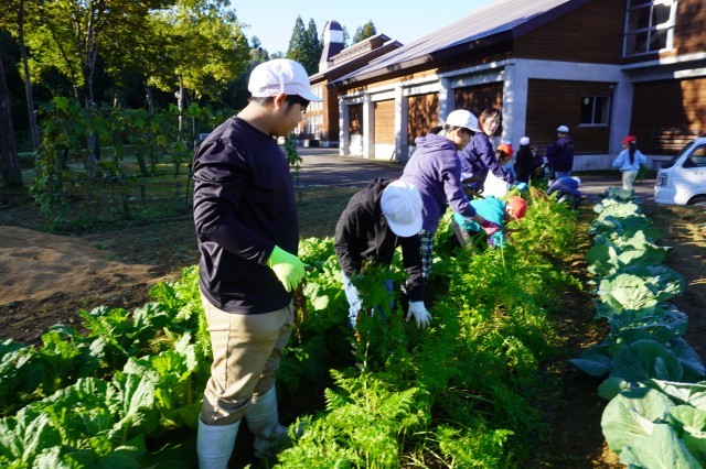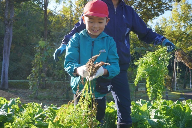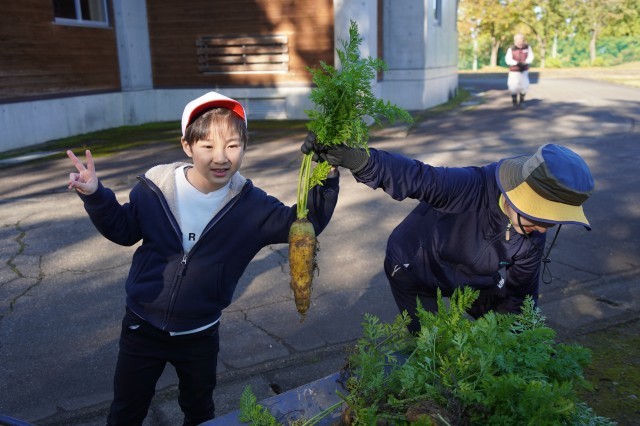 10月30日の今月最後の晴天の朝に、やまびこ農園で育ったにんじんを全校で収穫しました。にんじんの葉を抜くと、土の中からはオレンジ色のにんじんのほかに、黄色のにんじんも出てきて、子どもたちも驚いていました。黄色いにんじんは、甘みが強く、特有の香りが少ないのが特徴だそうです。各自が持って帰り、家で食べてもらえるようにしました。