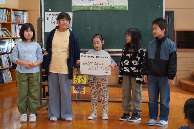 11月5日の朝の会で、「いじめ見逃しゼロ強調月間」として、全校でいじめ見逃しゼロスクール集会を行いました。各学級で考えた「いじめ見逃しゼロ作戦」を発表したり、教師が演じる場面からいじめ行為を考えたりしました。そのほかに、「ふわふわ言葉」として全校の一人一人に「○○さん、がんばってるね」メッセージを送りました。「みんな なかよし チーム後山」の全校スローガンのもと、相手に対する優しい気持ちといじめに気付く力が育つことを願います。