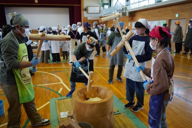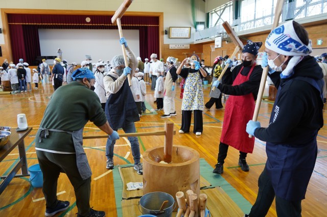 薮神小学校さんから「もちつき大会」のご案内をいただき、11月8日に希望児童・保護者・職員が参加させていただきました。毎年開催している「もちつき大会」は今年で35回を数える地域の伝統行事です。後山小学校からも自校の臼と杵を保護者の方から運んでいただき、後山チームでもちつきを行い、つきたてのもちの味を堪能できました。薮神地区もちつき実行委員会ともちつき大会PTAボランティアの皆様、どうもありがとうございました。