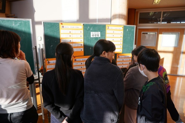 11月27日に、いじめ見逃しゼロスクールの取組で全校の一人一人に書いた「○○さん、がんばってるね!」メッセージを、みんなで見合いました。どの子も、うれしそうな表情を浮かべながら、自分や友達に対する優しい言葉を興味深く読んでいました。メッセージを読みながら、「みんな なかよし チーム後山」の全校スローガンを目指して、自分や相手を大切にする気持ちが育つことを願います。