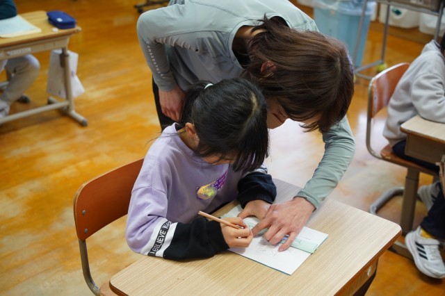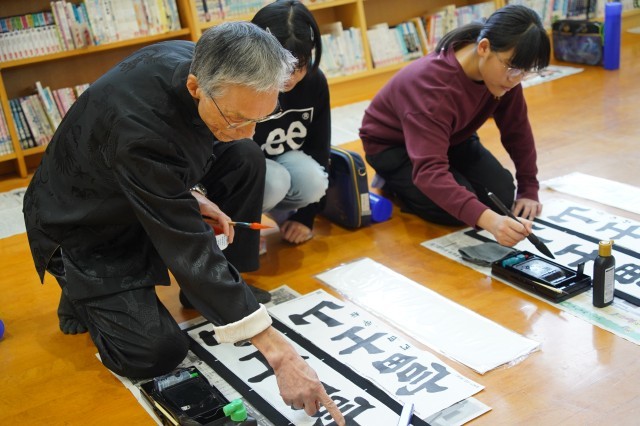 1/14に、2学期からご指導いただいている和田芳山先生をお招きして、書き初め大会を行いました。横画・縦画の筆使いを確認した後、約1時間を集中して取り組みました。作品は、県の書き初め大会に出品するほか、1/19(月)~30(金)まで校内に掲示しています。お時間がありましたらご覧ください。