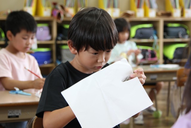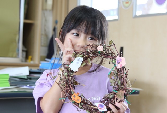 1年生は、アサガオのつるを輪にしてリースをつくっています。