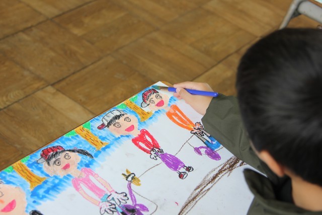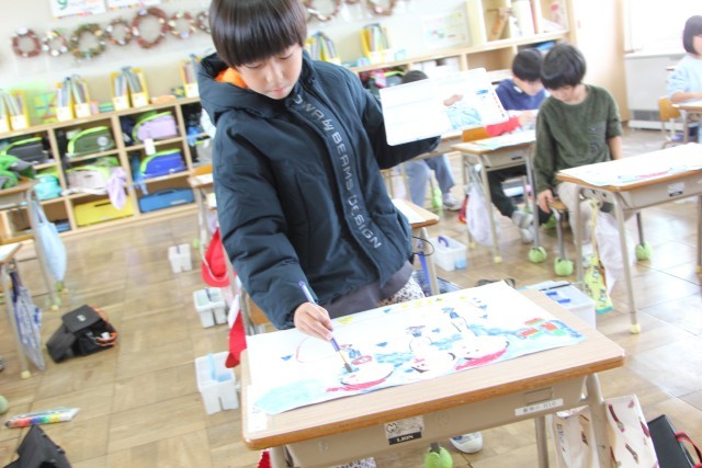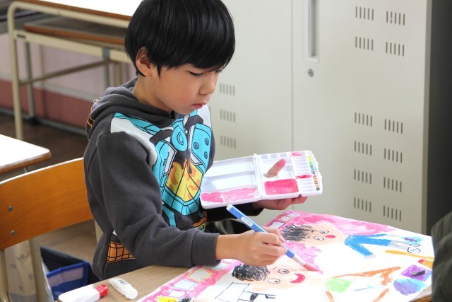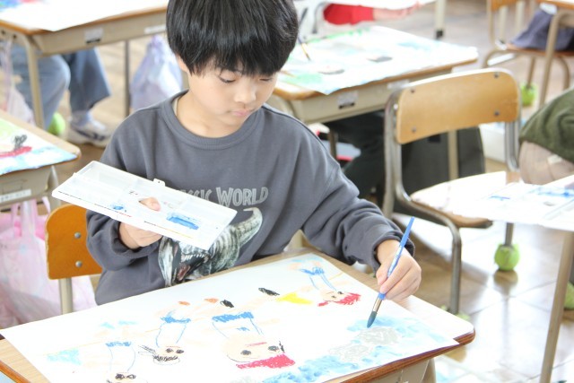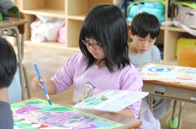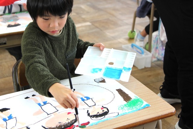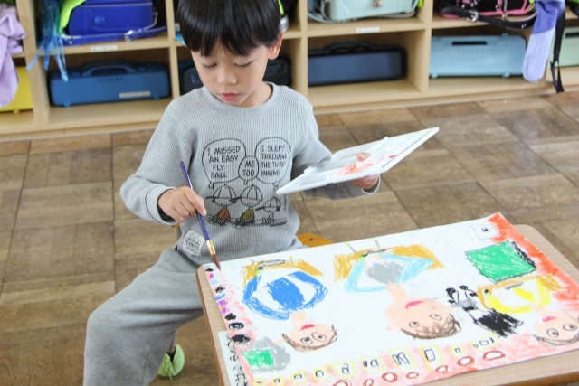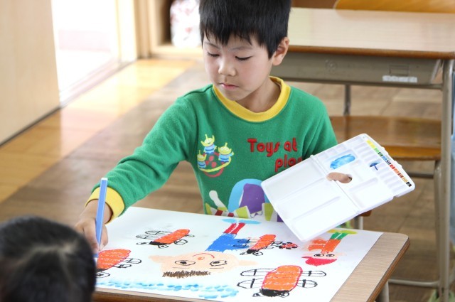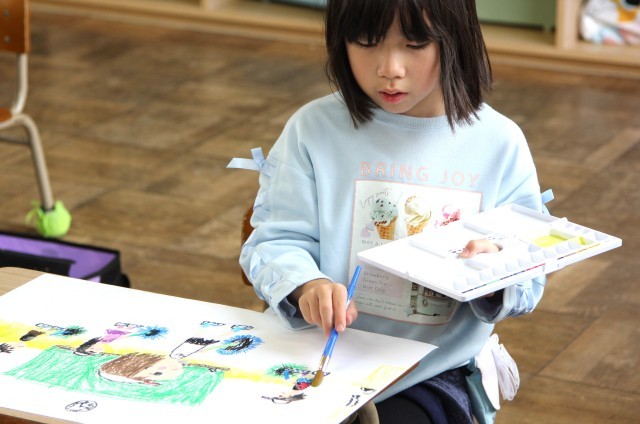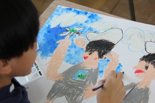 クレヨンで描いた絵に、今日は水彩絵の具を使って色付けをしました。
