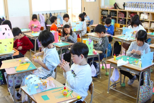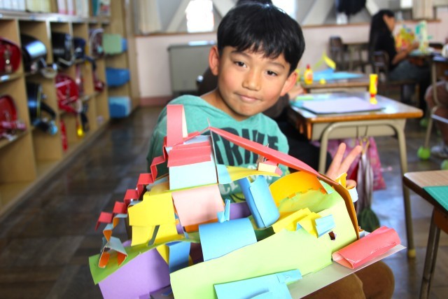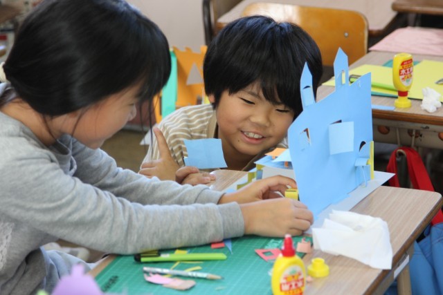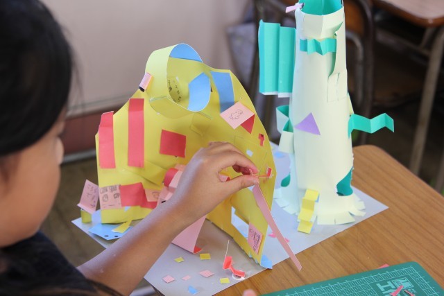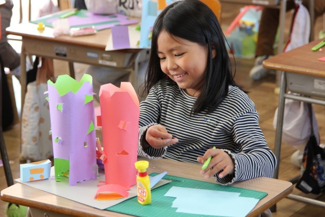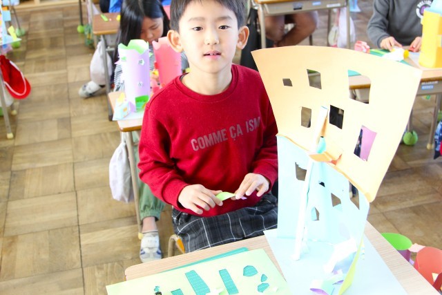 図工で、カッターを使った工作「まどのあるたてもの」を作成しています。